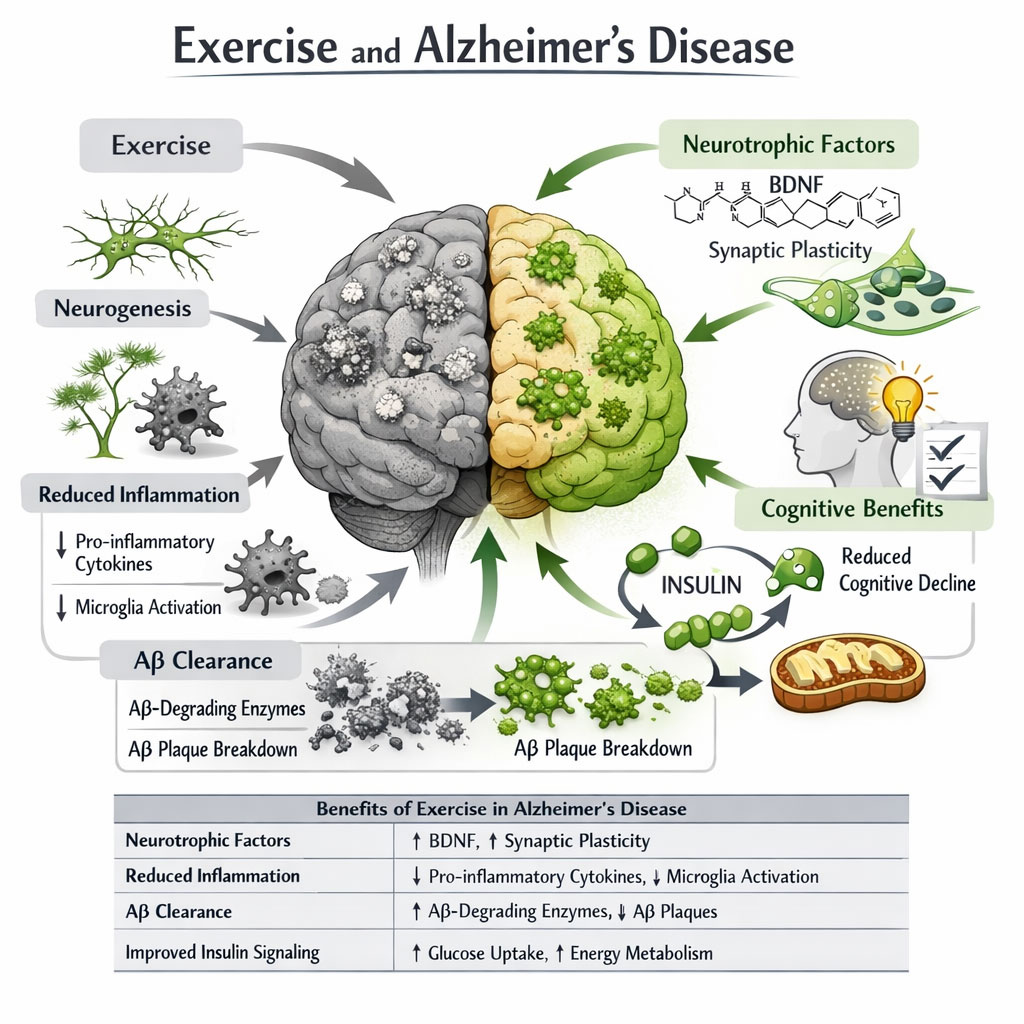 4. Synaptic plasticity and neurogenesis. Exercise increases synaptic connections and stimulates hippocampal neurogenesis [91]. Important roles are played by BDNF and other growth factors in the maintenance of cognitive capacities [92]. The importance of adult hippocampal neurogenesis in cognition is being highlighted by an increasing number of studies from research on humans and animals. Additionally, there is a strong correlation between neurodegenerative diseases such as Alzheimer's disease (AD) and age-related cognitive loss [93]. The major molecular pathways through which exercise influences Alzheimer’s disease pathology, including neurotrophic signaling, neuroinflammation, amyloid-β clearance, and metabolic regulation, are illustrated in Figure 2.