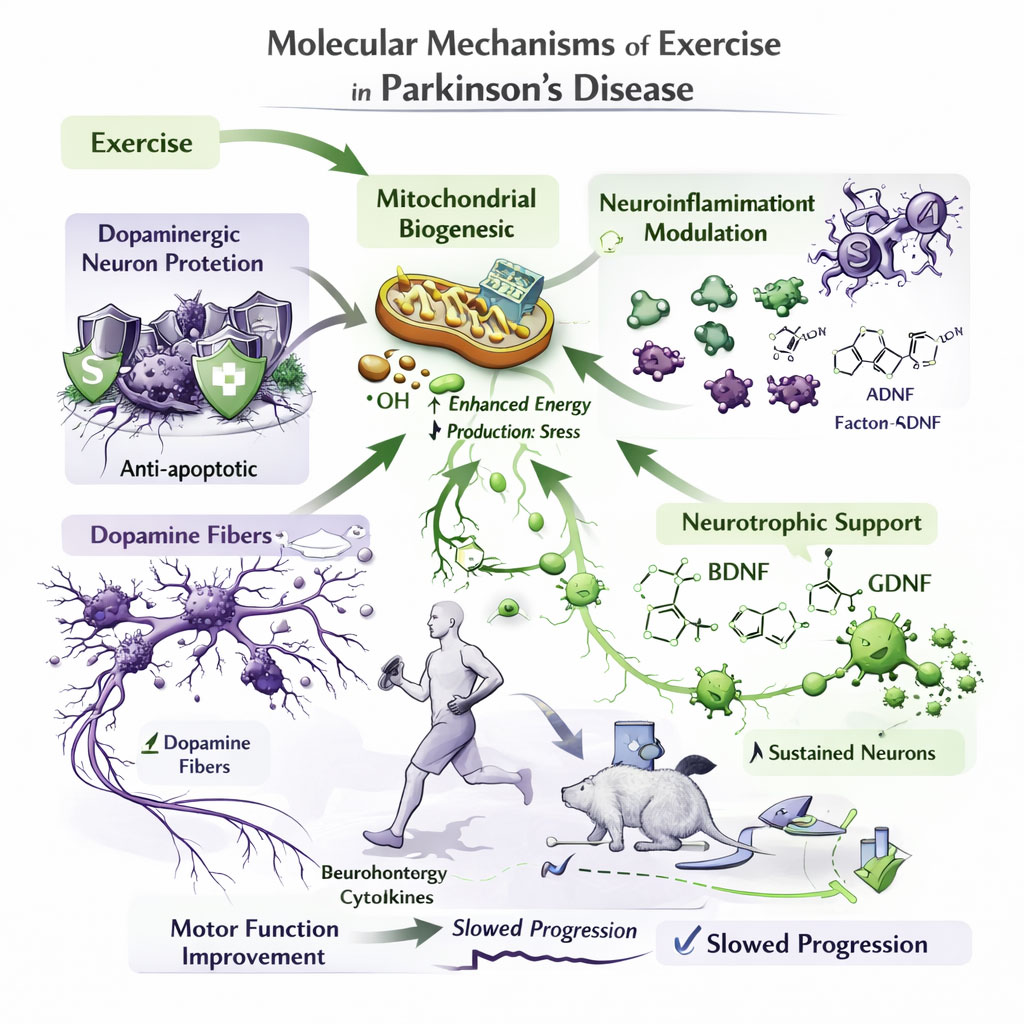 2. Mitochondrial biogenesis. Exercise improves mitochondrial biogenesis and function, which is essential for generating energy and reducing oxidative stress, which is a key contributor to the development of Parkinson's disease [95, 96].